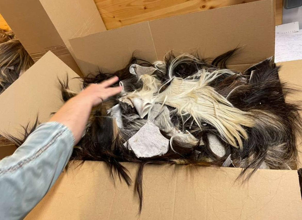 ein prall gefüllter Karton voller unterschiedlich großer Fellreste...