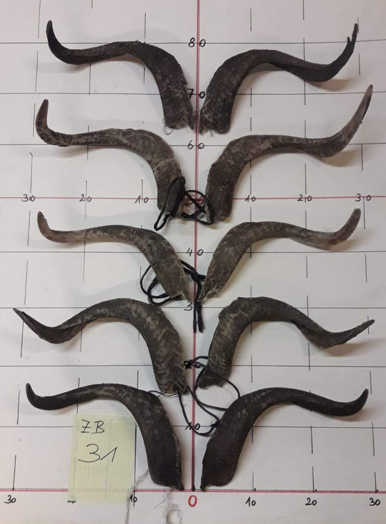 5 Paar unbehandelte, naturgewachsene, hohle Hörner von heimischen Goaßn